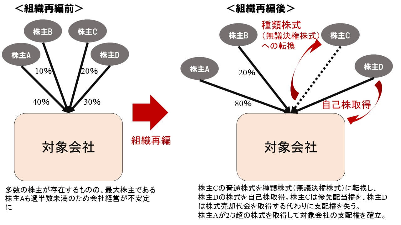 そこで、一部の普通株式を種類株式(無議決権株式)に転換するとともに、株式を自己株取得することにしました。組織再編の結果として2/3超の議決権を取得して、対象会社様の支配権を確立できました。